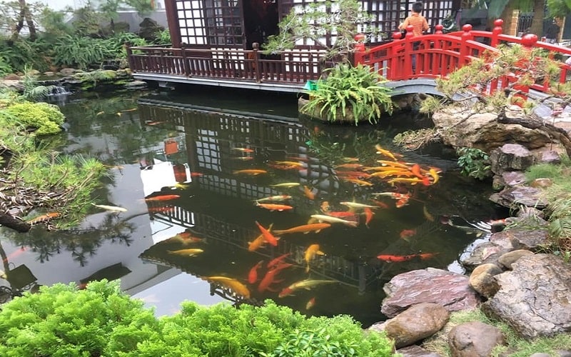 Không những vậy quán còn được trang trí với nhiều cây xanh, cây cảnh và điểm nhấn là hồ Cá Koi nằm cạnh núi đá và thác nước khiến ta có cảm giác đây không chỉ là quán cafe mà còn là một điểm nghĩ dưỡng cho ta những giây phút thư giãn, thoải mái nhất.
