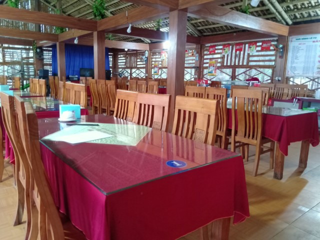 ân của Nhà hàng, tại đây Du khách có thể nghỉ ngơi, uống trà dưới tán cây Phi lao xanh mát. 2 cổng phụ 2 bên dẫn thẳng vào Nhà hàng Lá Cọ A1 và A2 với diện tích rộng rãi, sang trọng. Với thiết kế phong khách Nhà sàn độc đáo, vừa hiện đại vừa dân giã kết hợp hệ thống âm thanh, sân khấu và bar mini ch
